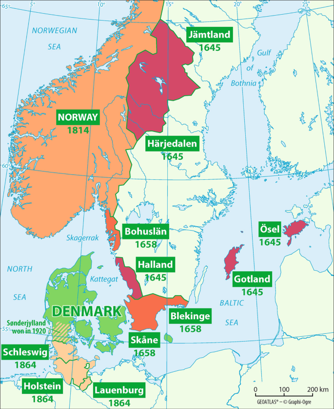 Roskildefreden er en af de hårdeste i dansk historie – vi havde allerede mistet væsentlige dele af riget i 1645. Kort fra tacitus.nu