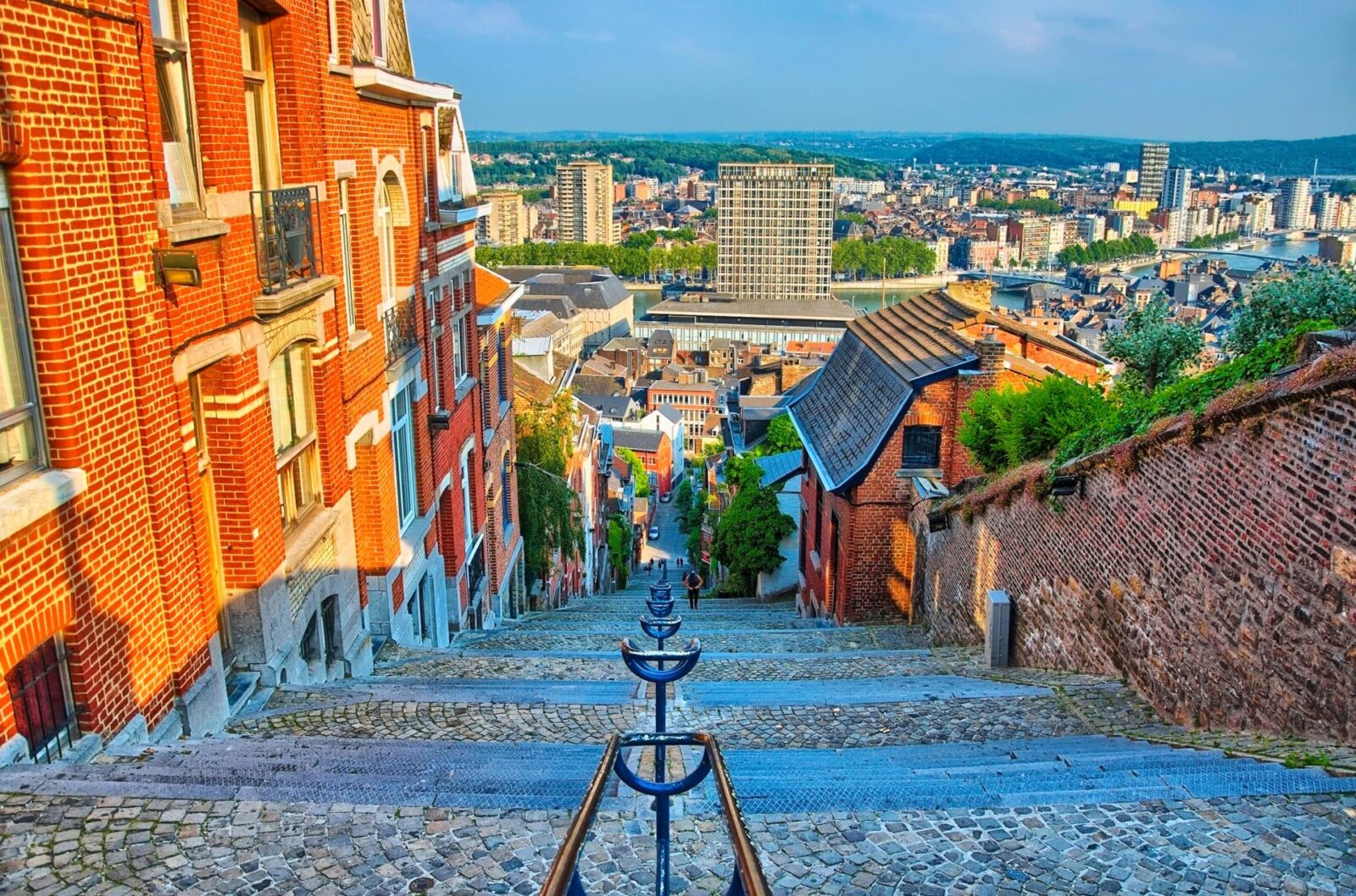 Montagne de Bueren er en trappe der fører op til en fantastisk udsigt over Liege, der ligger ved floden Meuse og med Ardennernes bjerge i udsyn. Foto fra wikipedia